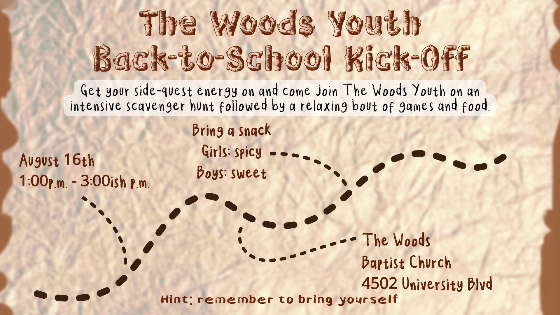 Get your side-quest energy on and come join The Woods Youth on an intensive scavenger hunt followed by a relaxing bout of games and food. Ladies, bring something spicy; and gentlemen, bring something sweet. Contact Zaca for more info at zacawilsontwbc@gmail.com Or 806-340-9224