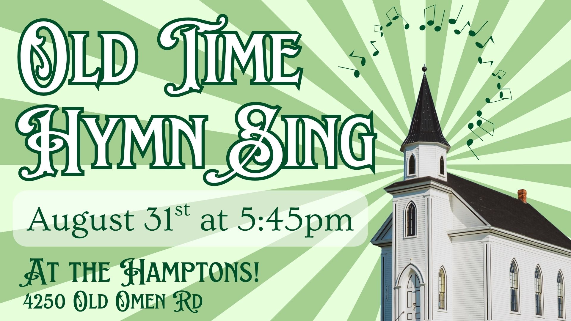 Old Time Hymn Sing Date: 08 / 31 / 2025 Time: 5:45-6:30pm The Hamptons (Assisted Living) @4250 Old Omen Rd We're joining those who can't normally join us for the next fifth Sunday Hymn Sing! Bring along your singing voice for hymn requests, quartet callouts, and old-time worship. Meet in the dining room of the […]